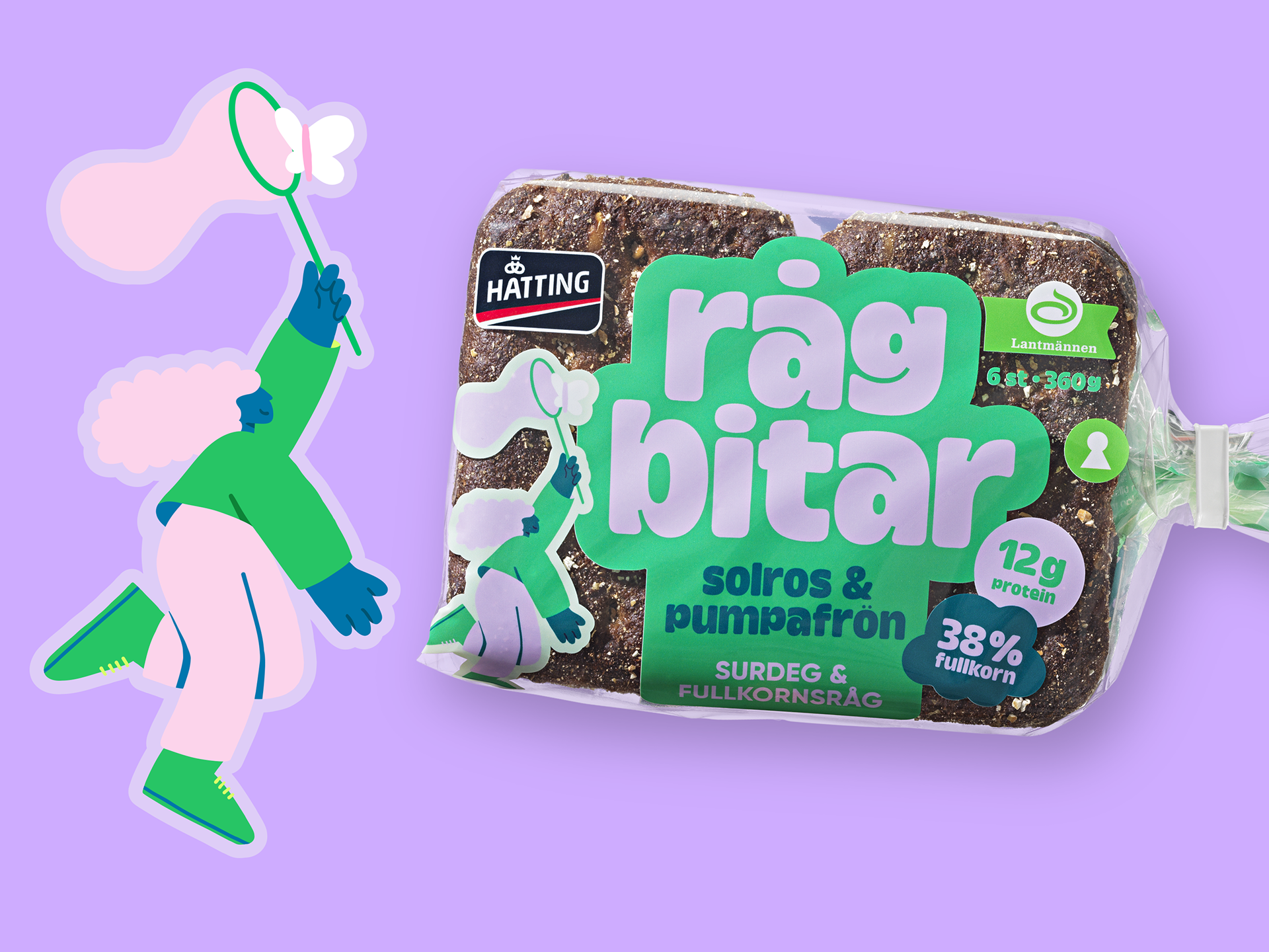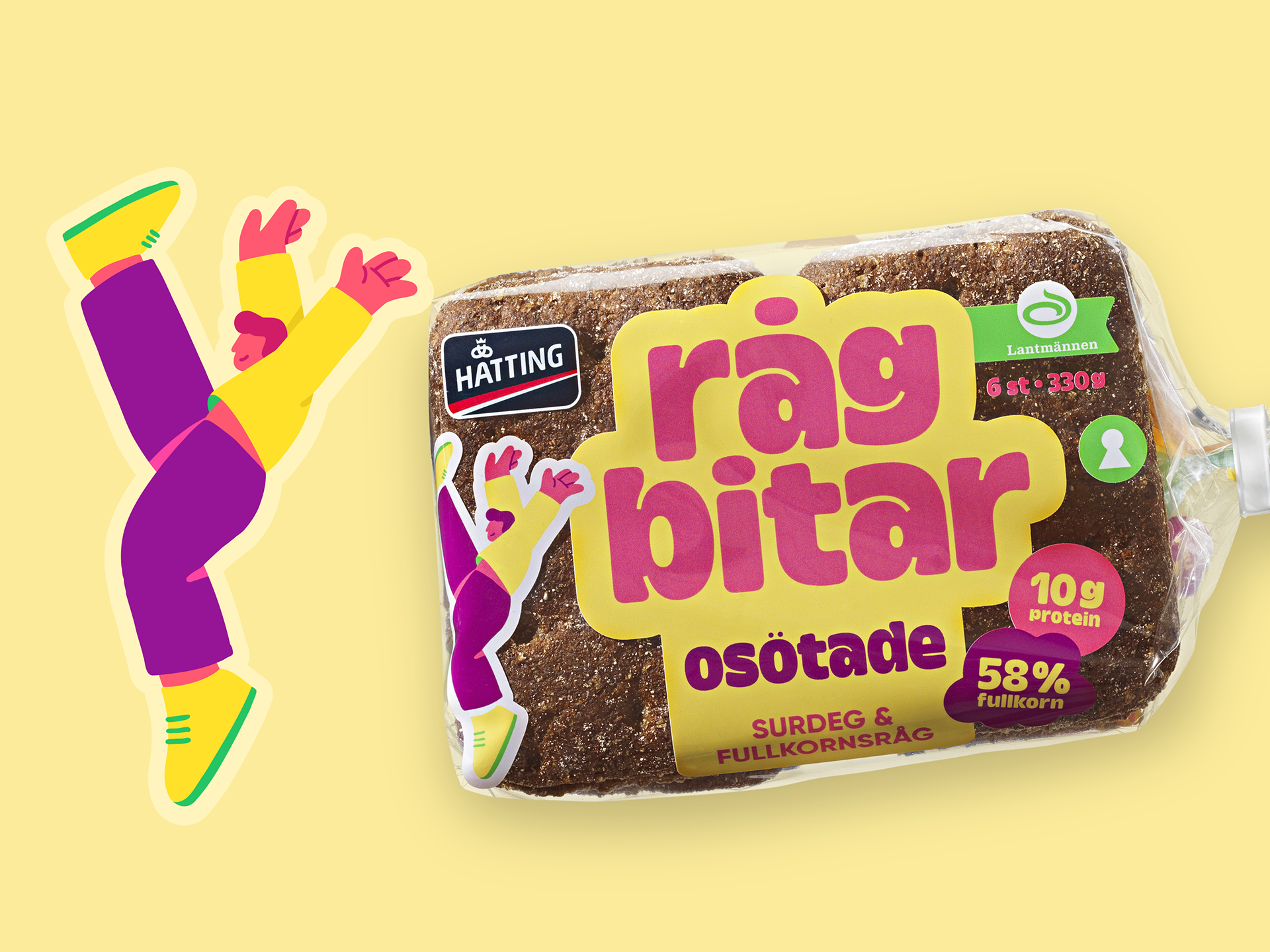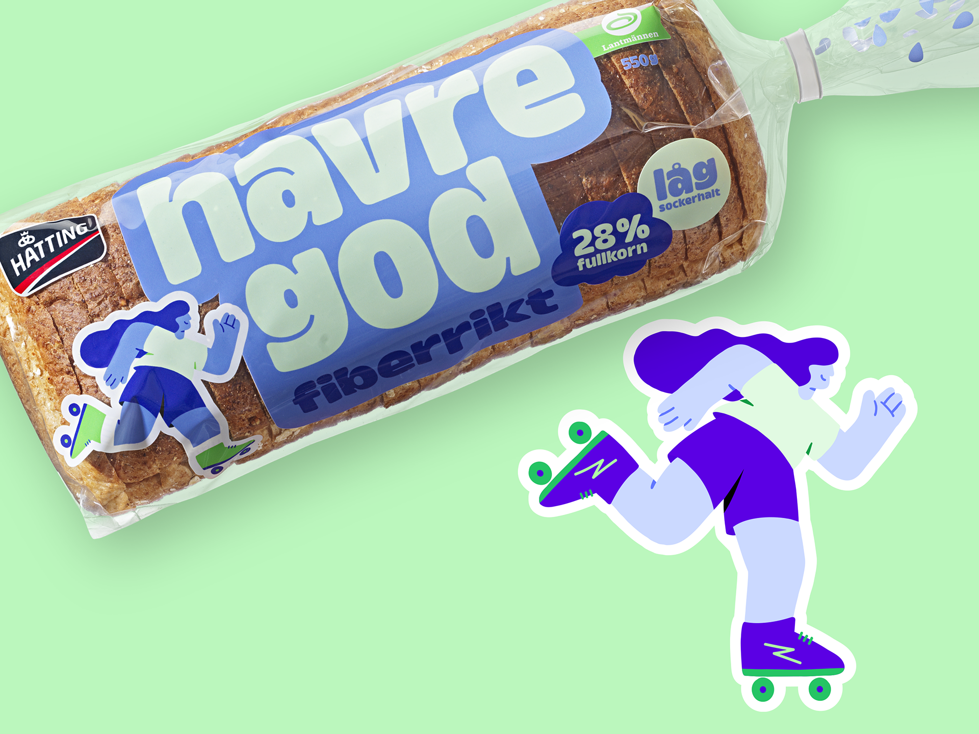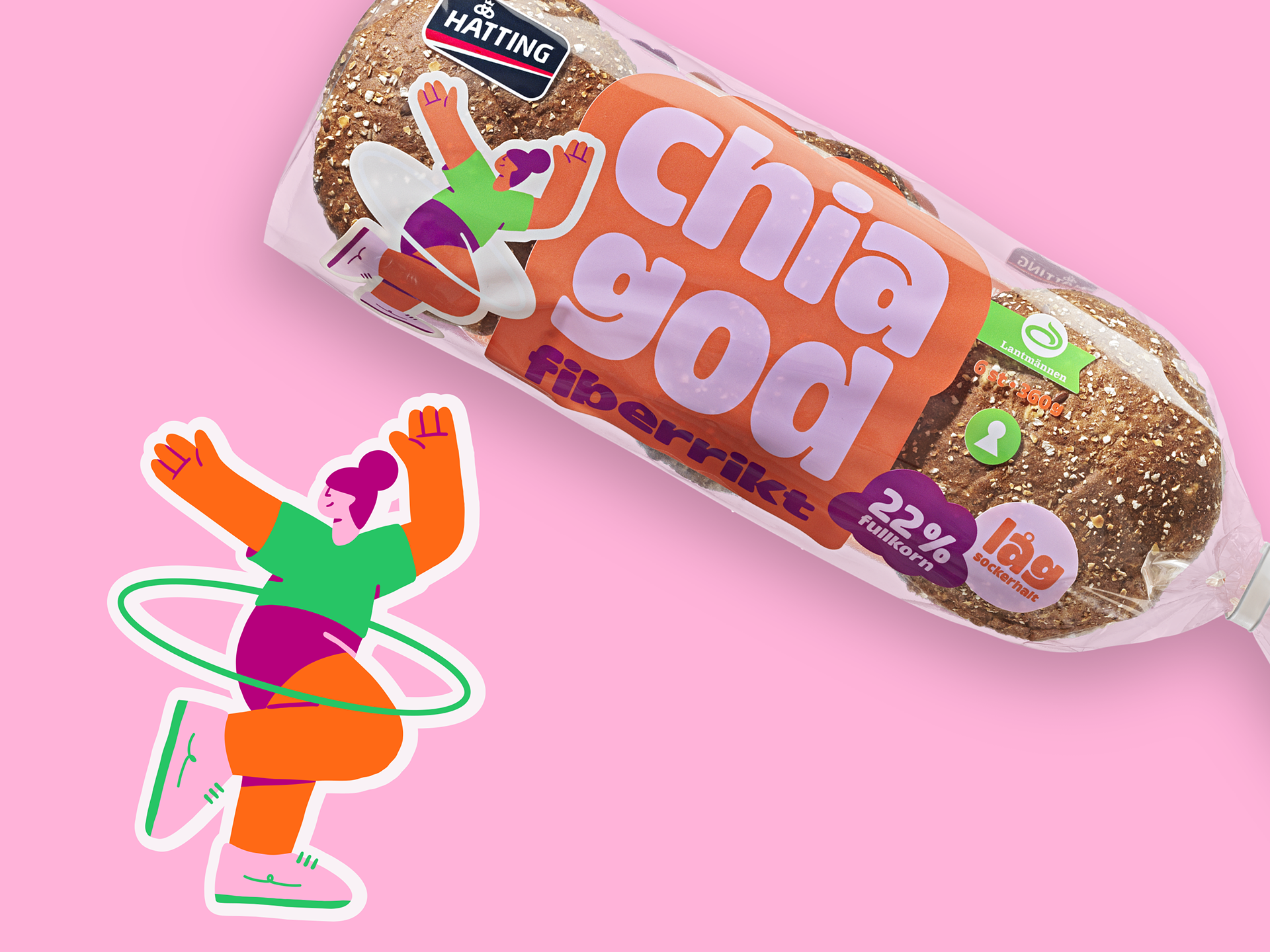 I was commissioned by Identity Works to create a series of illustrations for Hatting's new bread packaging. The goal was to break away from traditional bread packaging by incorporating bold, colorful characters and striking typography to make the design truly stand out on supermarket shelves.